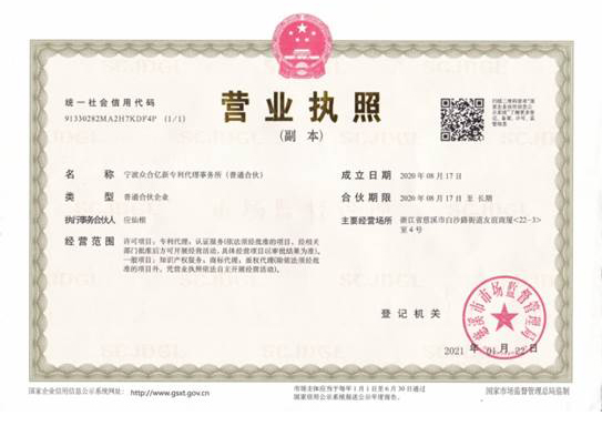 浙江億新知識產(chǎn)權(quán)服務(wù)有限公司前身為慈溪眾合知識產(chǎn)權(quán)代理事務(wù)所,創(chuàng)始于2004年,為了服務(wù)更多的創(chuàng)新企業(yè),實現(xiàn)“服務(wù)億萬創(chuàng)新企業(yè)”的理念,后更名為浙江億新知識產(chǎn)權(quán),旗下公司包括:寧波眾合億新專利代理事務(wù)所(機構(gòu)代碼33405)、中范(北京)認證有限公司。其中寧波眾合億新專利代理事務(wù)所是慈溪市科技服務(wù)聯(lián)盟理事單位,前灣區(qū)知識產(chǎn)權(quán)工作站。公司位于浙江省慈溪市文化商務(wù)區(qū)友誼商廈,并在北京、青島設(shè)有辦事處。
